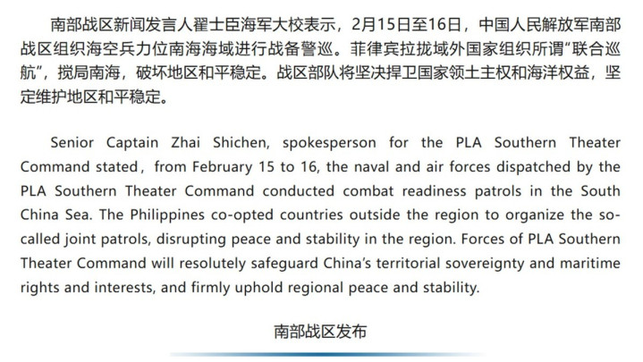 2月17日,南部战区新闻发言人翟士臣大校发布了一份通报,内容明确表示在2月15日至16日,南部战区组织海空兵力在南海进行战备警巡,痛斥菲律宾拉拢域外第三方国家进行所谓的“联合巡航”,破坏南海地区的和平稳定。战区部队将坚决捍卫国家领土主权和海洋权益,坚定维护地区和平稳定!